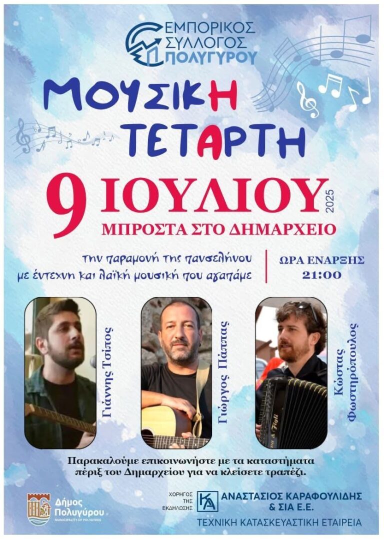 Περισσότερα…Συνεχίζονται οι εκδηλώσεις στον Δήμο Πολυγύρου και αυτή την εβδομάδα, 7 με 13 Ιουλίου 2025. Την Τετάρτη 9 Ιουλίου θα πραγματοποιηθεί στον Πολύγυρο η πρώτη μουσική πλατεία με έντεχνη και