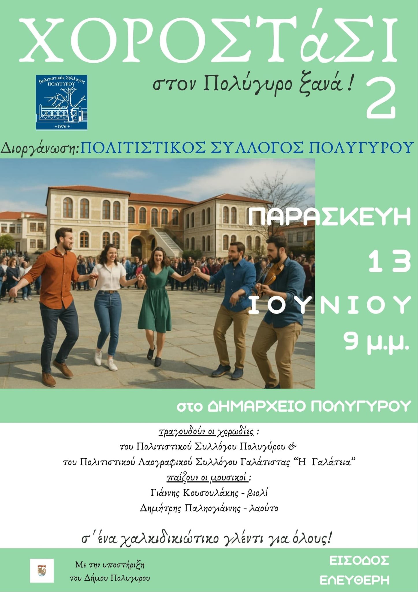 «ΧΟΡΟΣΤάΣΙ 2 στον Πολύγυρο ξανά!», είναι ο τίτλος της εκδήλωσης που διοργανώνει σήμερα Παρασκευή 13 Ιουνίου 2025 και ώρα 21:00, ο Πολιτιστικός Σύλλογος Πολυγύρου, στον αύλειο χώρο του Δημαρχείου, με την υποστήριξη του Δήμου Πολυγύρου.