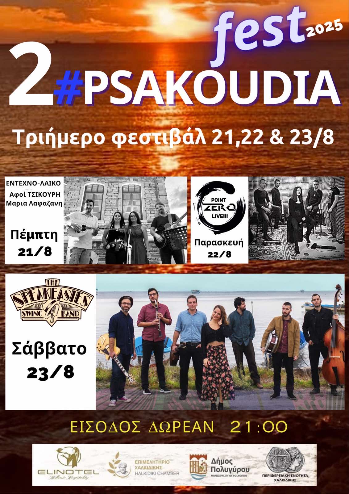 Ο Σύλλογος Επαγγελματιών Κατοίκων και Ιδιοκτητών Ψακουδίων «Η Σερμύλη» διοργανώνει για δεύτερη συνεχή χρονιά το Psakoudia Fest, ένα μουσικό φεστιβάλ με το εξής πρόγραμμα: