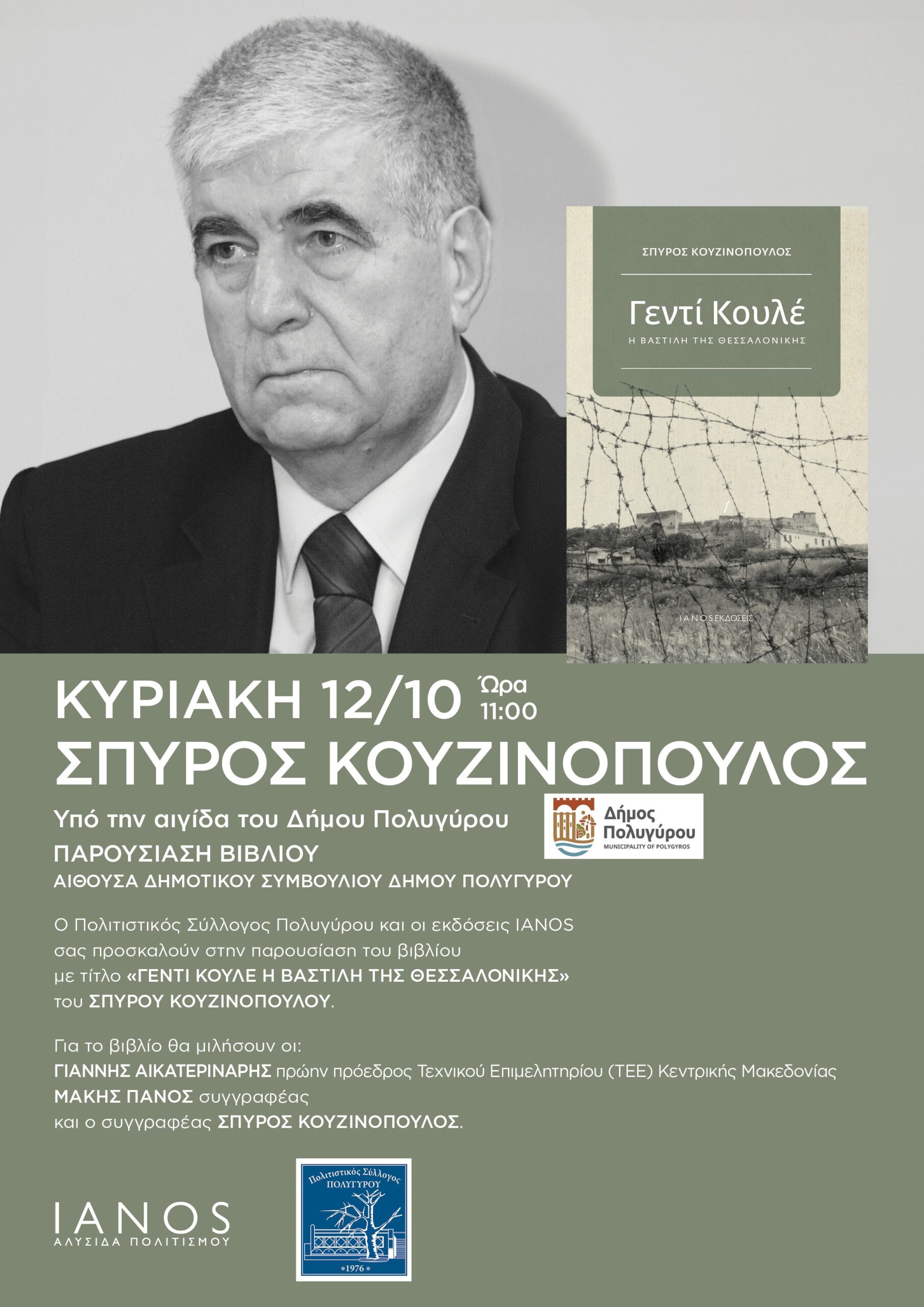 Ο Πολιτιστικός Σύλλογος Πολυγύρου και οι εκδόσεις ΙΑΝΟΣ θα παρουσιάσουν την Κυριακή 12 Οκτωβρίου 2025 και ώρα 11:00 π.μ., στην αίθουσα του Δημοτικού Συμβουλίου, το βιβλίο του Σπύρου Κουζινόπουλου με τίτλο «Γεντί Κουλέ, Η ΒΑΣΤΙΛΗ ΤΗΣ ΘΕΣΣΑΛΟΝΙΚΗΣ».