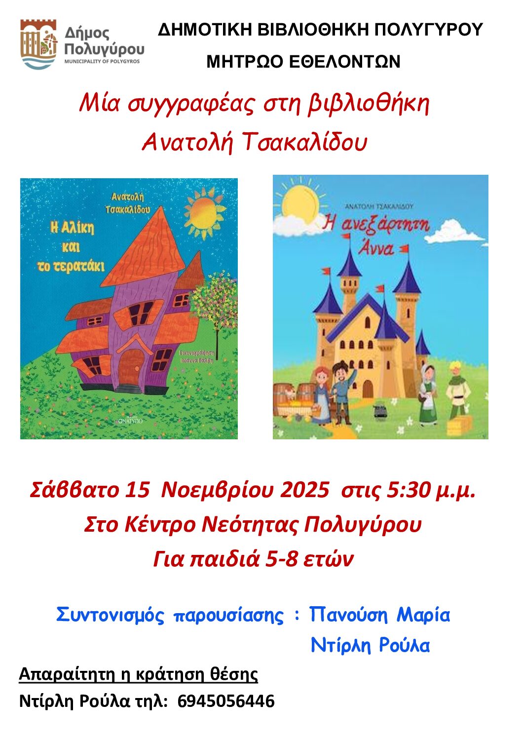 Ο Δήμος Πολυγύρου σε συνεργασία με το Μητρώο Εθελοντών, προσκάλεσε τη συγγραφέα Ανατολή Τσακαλίδου να παρουσιάσει το Σάββατο 15 Νοεμβρίου και ώρα 17:30, στο Κέντρο Νεότητας Πολυγύρου, τα δύο βιβλία της “Η Ανεξάρτητη Άννα” και “Η Αλίκη και το τερατάκι”, σε παιδιά ηλικίας 5-8 ετών.