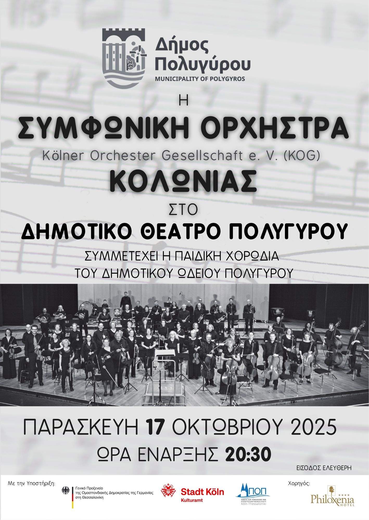 Αξίζει να σημειωθεί ότι η Συμφωνική Ορχήστρα Kölner Orchester Gesellschaft λαμβάνει μέρος στα φετινά «ΔΗΜΗΤΡΙΑ» του Δήμου Θεσσαλονίκης και η δεύτερη συναυλία που θα δώσει είναι αυτή στον Δήμο Πολυγύρου.