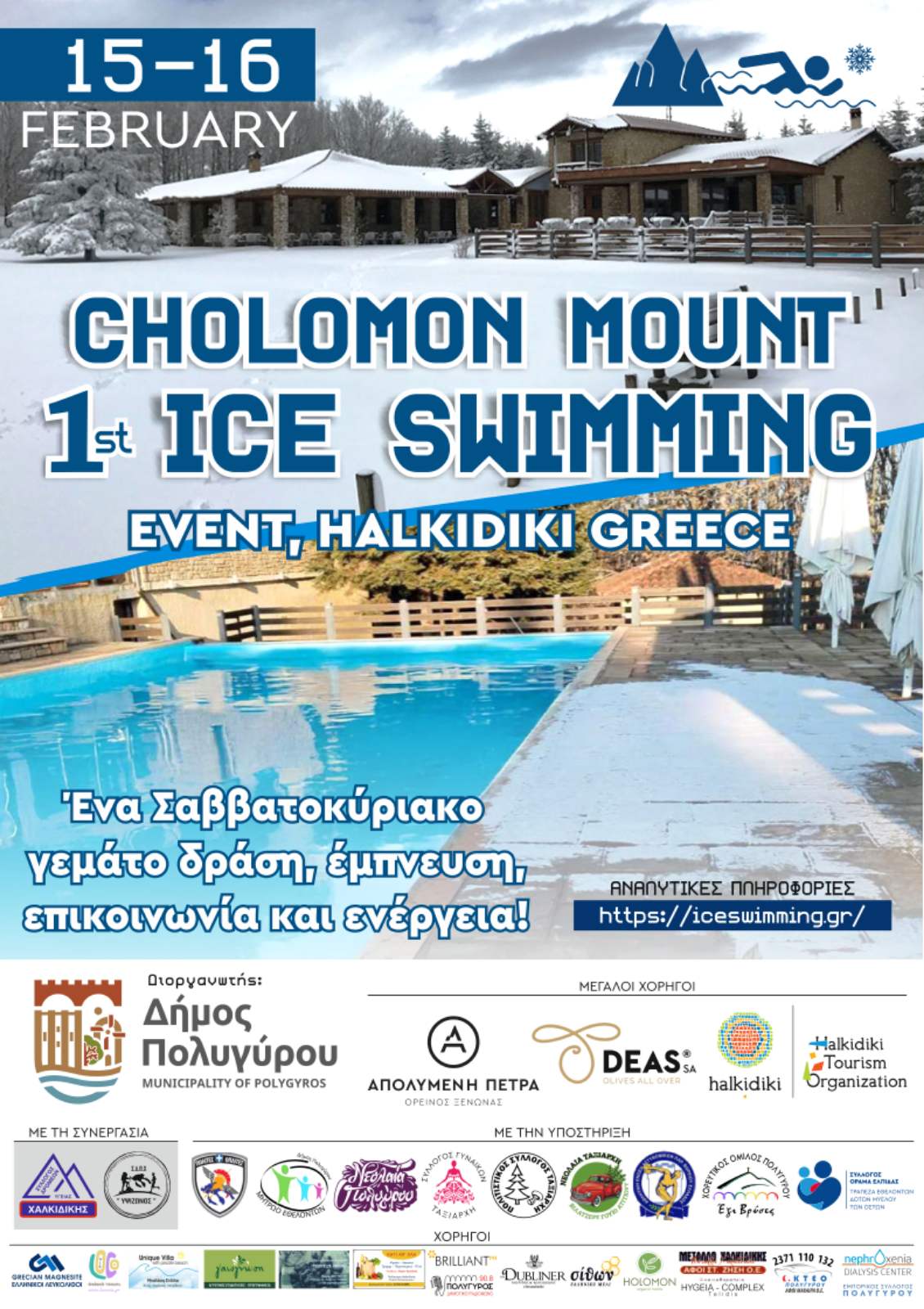 Ένα διήμερο γεμάτο δράση, ενέργεια και πρωτοτυπία διοργανώνει ο Δήμος Πολυγύρου το Σάββατο 15 και την Κυριακή 16 Φεβρουαρίου 2025, στον Ταξιάρχη Χαλκιδικής! Το 1st Ice Swimming στην Ελλάδα αναμένεται να κεντρίσει το ενδιαφέρον του κόσμου, καθώς η κολύμβηση θα γίνει σε παγωμένο νερό, στην καρδιά του χειμώνα, αναδεικνύοντας μια άλλη πλευρά της Χαλκιδικής!