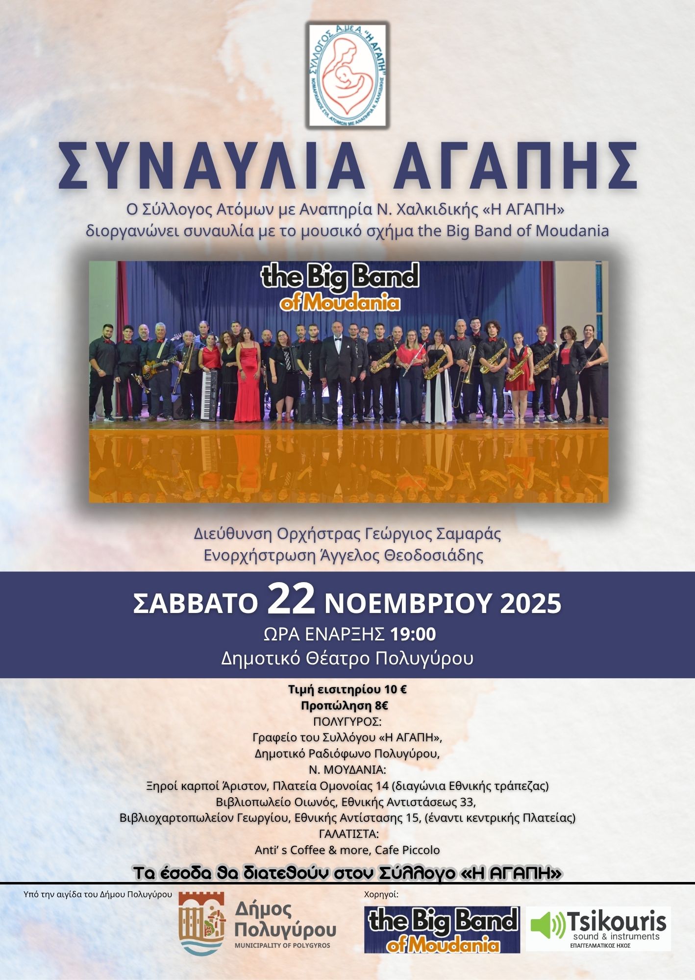 Ο Σύλλογος Ατόμων με Αναπηρία Ν. Χαλκιδικής « Η ΑΓΑΠΗ », διοργανώνει ΣΥΝΑΥΛΙΑ ΑΓΑΠΗΣ με το μουσικό σχήμα the Bing Band of Moudania, το Σάββατο 22