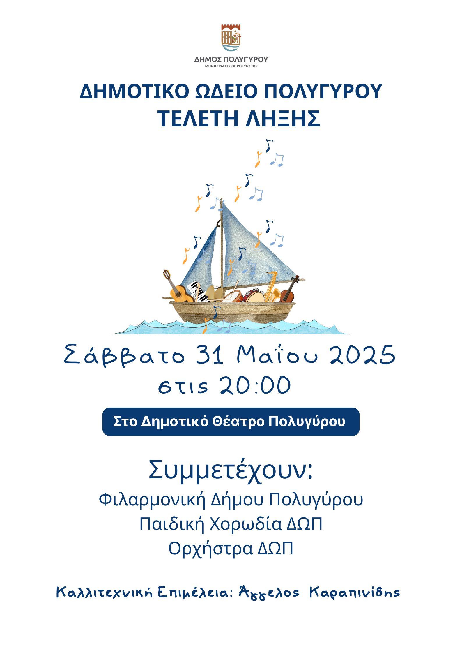 Ο Δήμος Πολυγύρου και το Δημοτικό Ωδείο προσκαλούν το κοινό στην ετήσια Τελετή Λήξης των μαθημάτων για το σχολικό έτος 2024-2025, το Σάββατο 31 Μαΐου 2025 και ώρα 20:00, στο Δημοτικό Θέατρο Πολυγύρου.